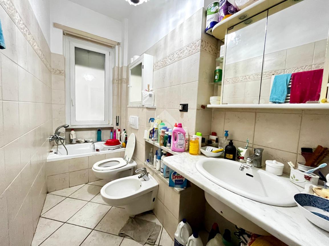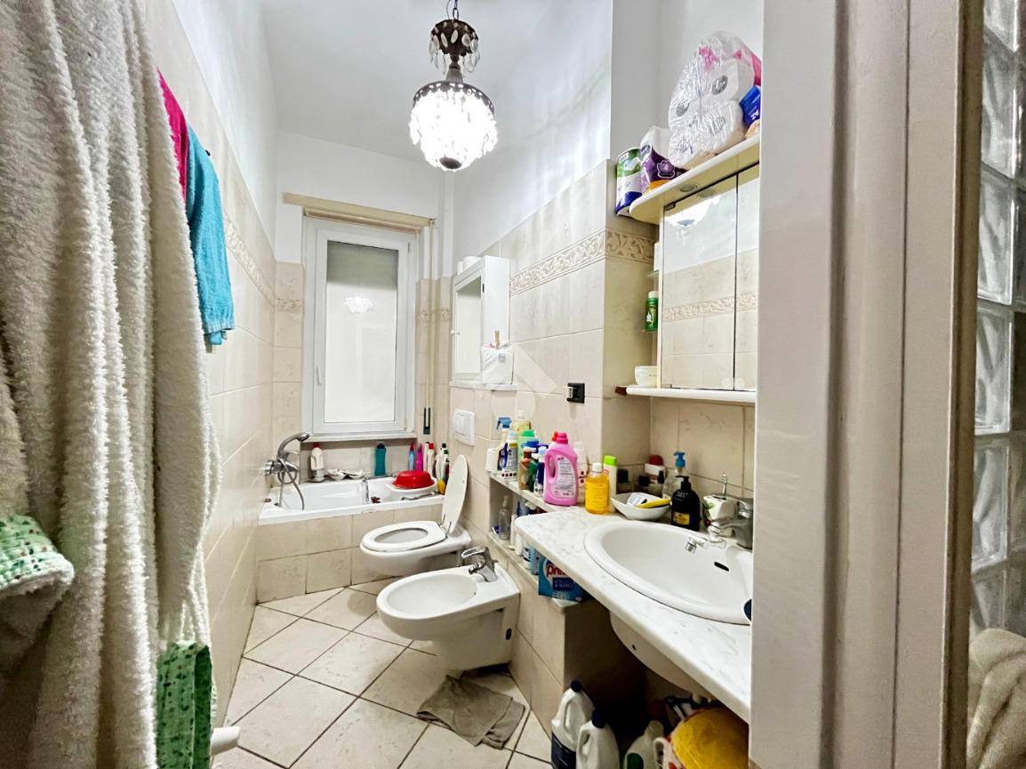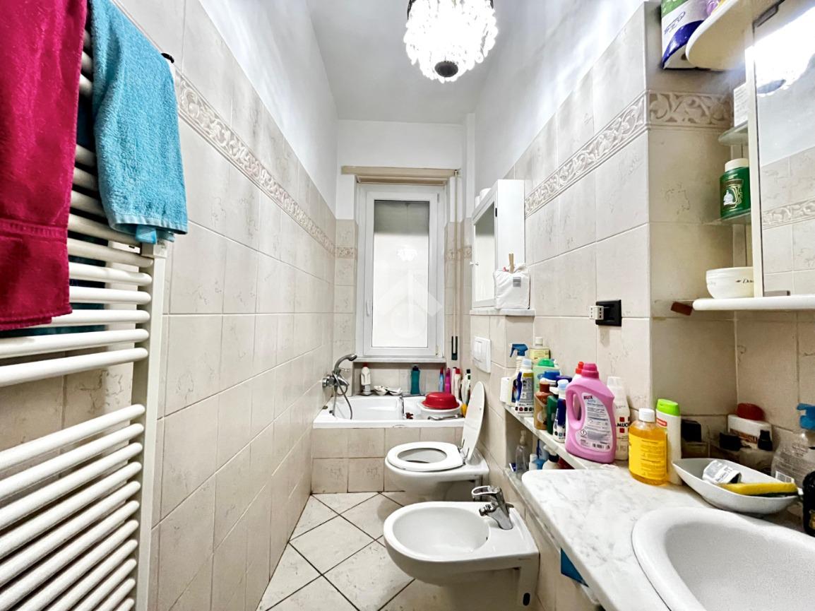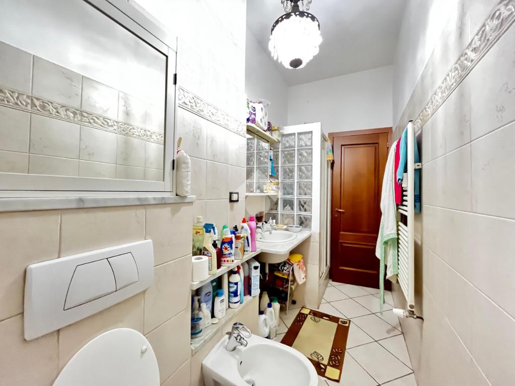 Il servizio igienico finestrato, raccolto e pratico, presenta attualmente sia una piccola vasca, che un box doccia.